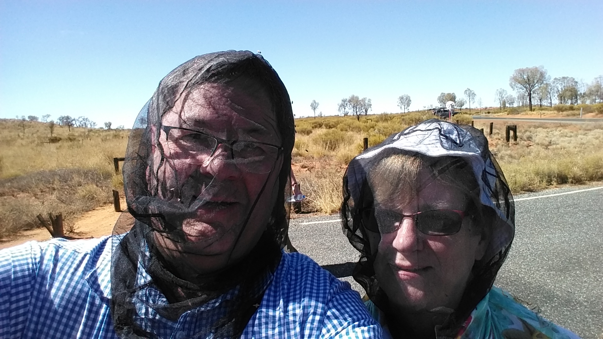 Photos could be better, but restricted to taking them with my tablet, to avoid having to transfer for the purposes of this blog. Deny absolutely, that the quality had anything to do with several glasses of bubbly offered by our host on arrival, accompanied by canapes. – They know how to look at a bit of rock over here in Oz! This afternoon when we passed by, we could see quite a number of people climbing the Rock- climb was via one of the ridges and assisted by a guide wire all the way. All climbing of the Rock will cease from the 26th October this year in recognition of the meaning it has for the Aboriginals. The monolith is currently 1042ft in height but is sinking in to the sand – very slowly! It is 6mls round the base, of which we will be walking part tomorrow, and according to a study completed by Darwin University, it weighs apx 145 billion tons – a useful piece of information for the next pub quiz! Temperature was a pleasant 36deg today, but both this area and Alice suffer from vast numbers of flies. Like small house flies which don’t bite, but due to the lack of moisture in the soil, they seek out any human moisture, especially around the eyes, ears and mouth! Extremely annoying! Hence the reason for us modelling the rather natty, 2019 fly net creation.