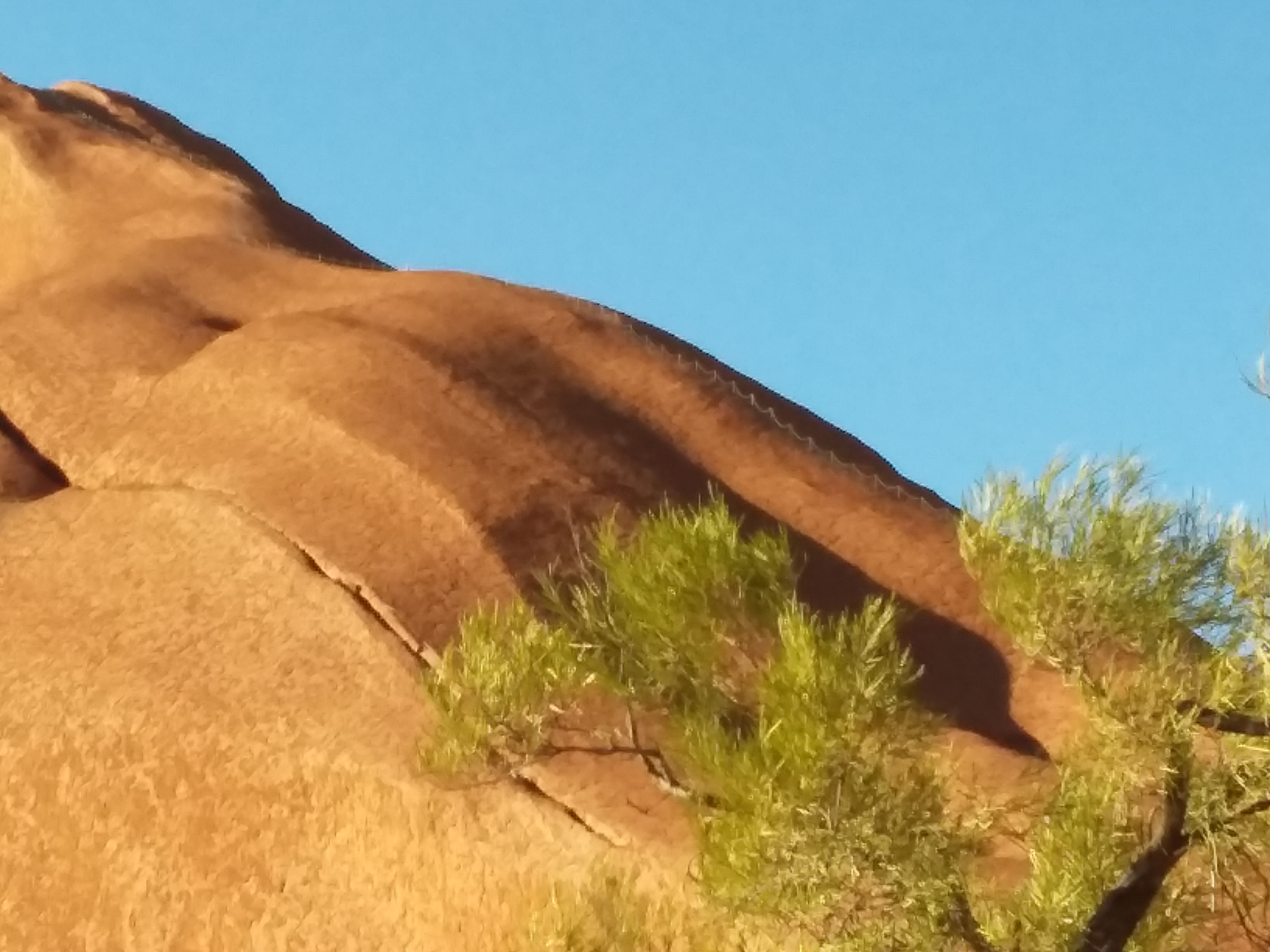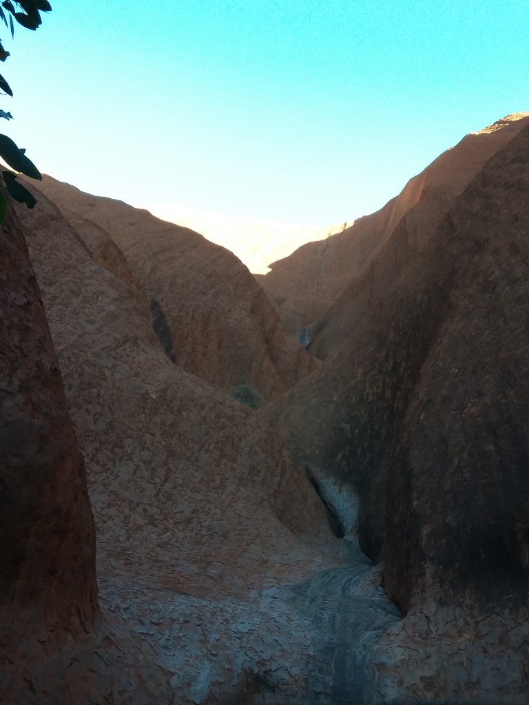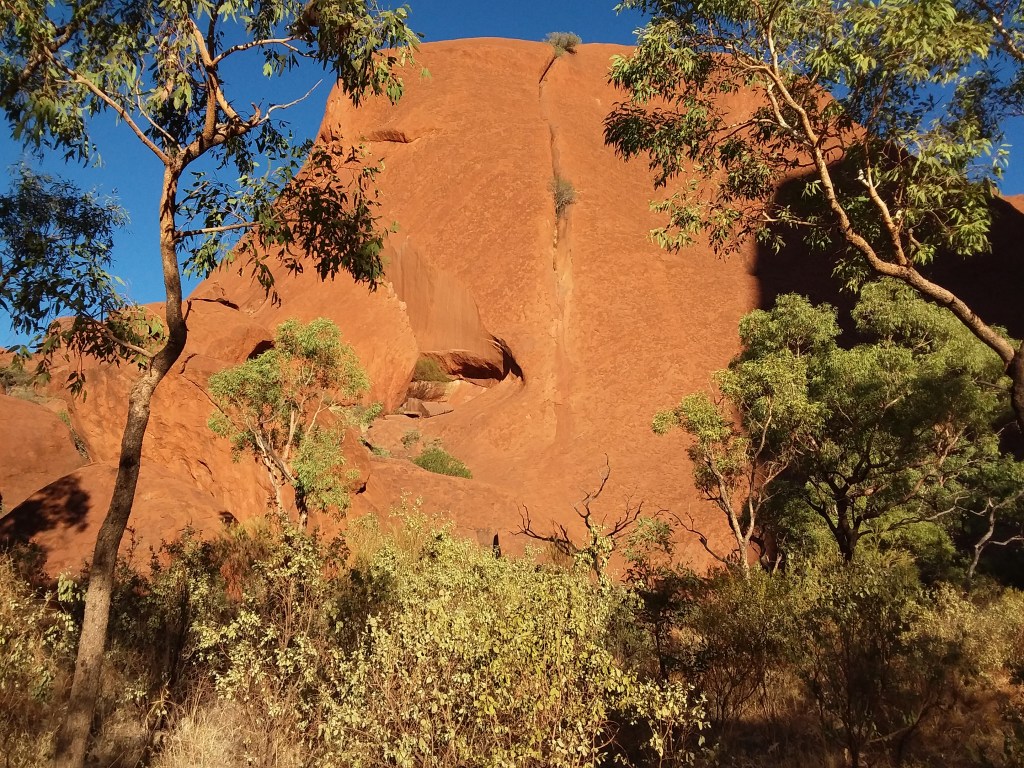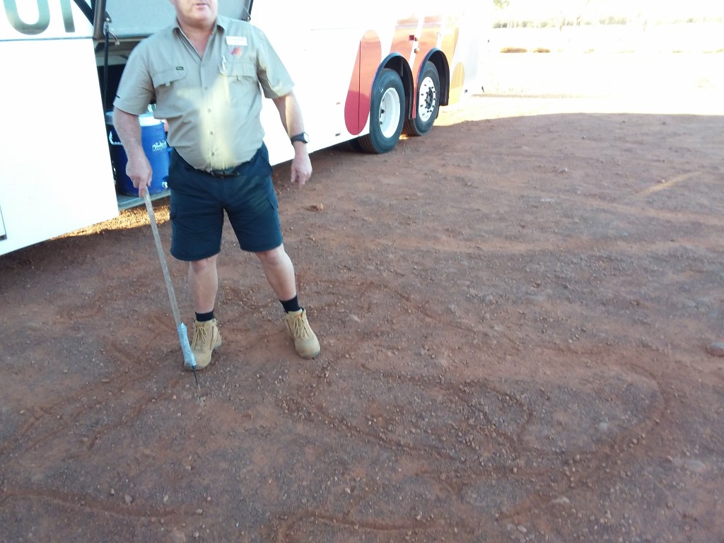 we had a couple of hours walk round part of the base of the Rock, looking at the faults in the Rock and at various geological phenomena which gave rise to the Aboriginal understanding of this special location. Interesting, also, tapping the hard surface of the Rock and hearing it sound hollow. Apparently, the Rock rolled over into it’s current position several million years ago.