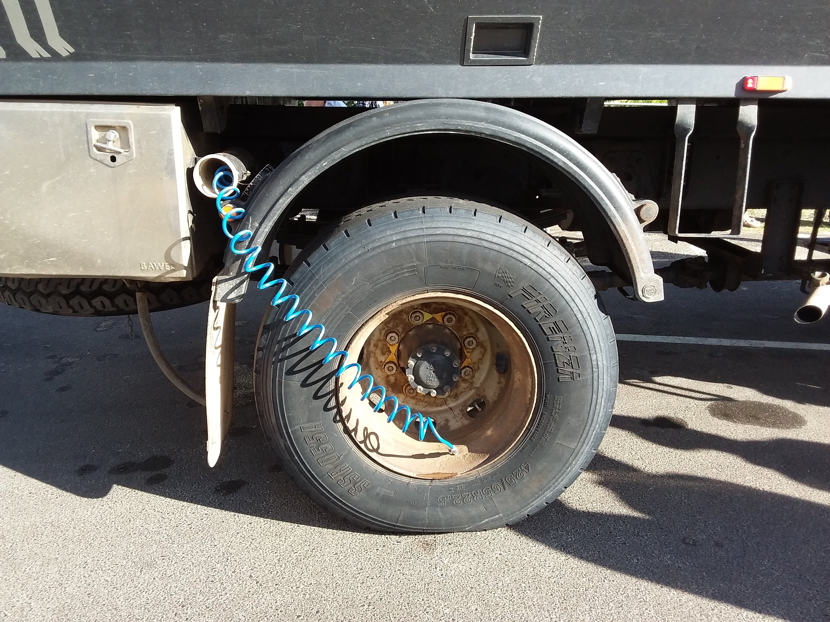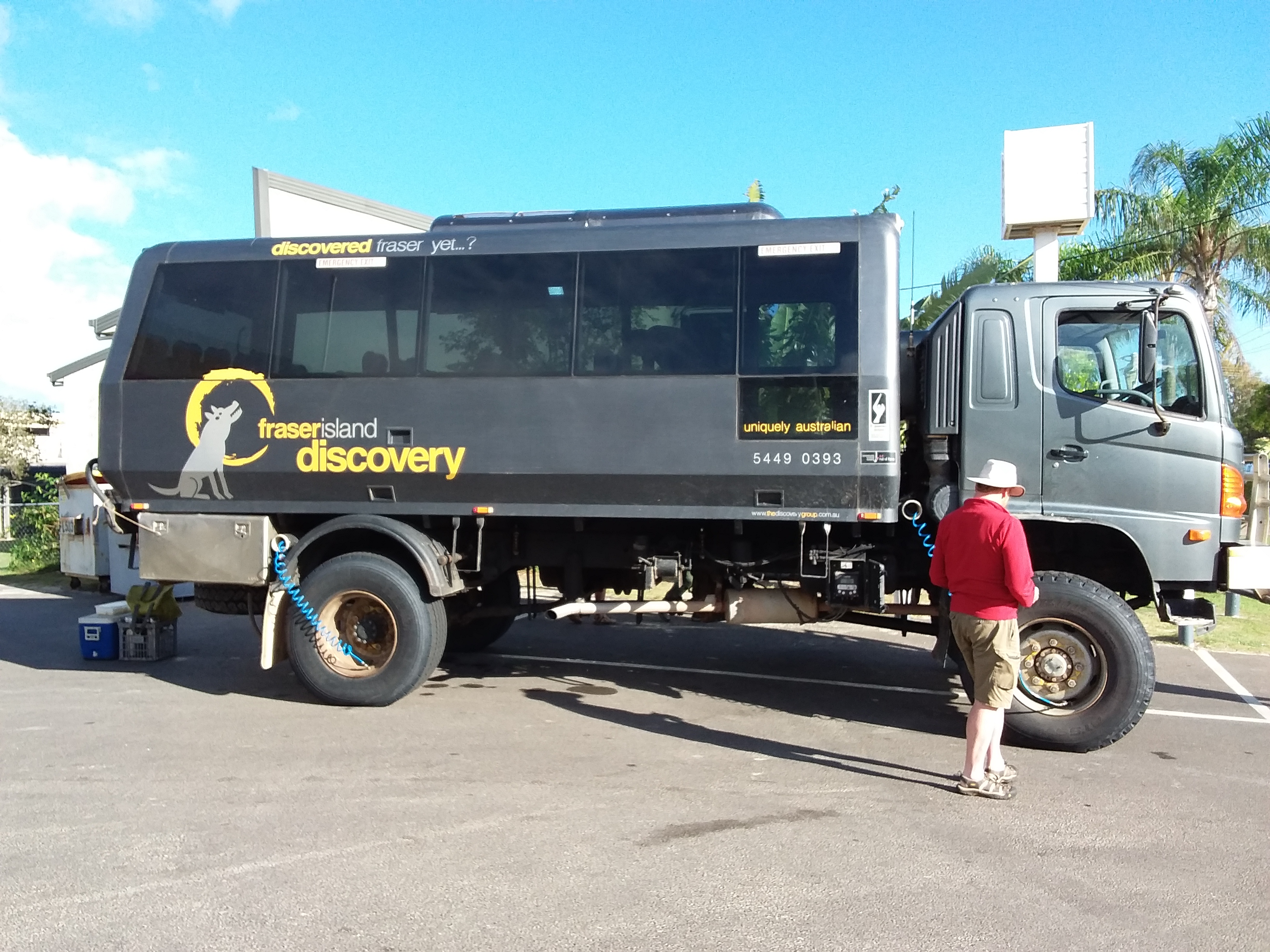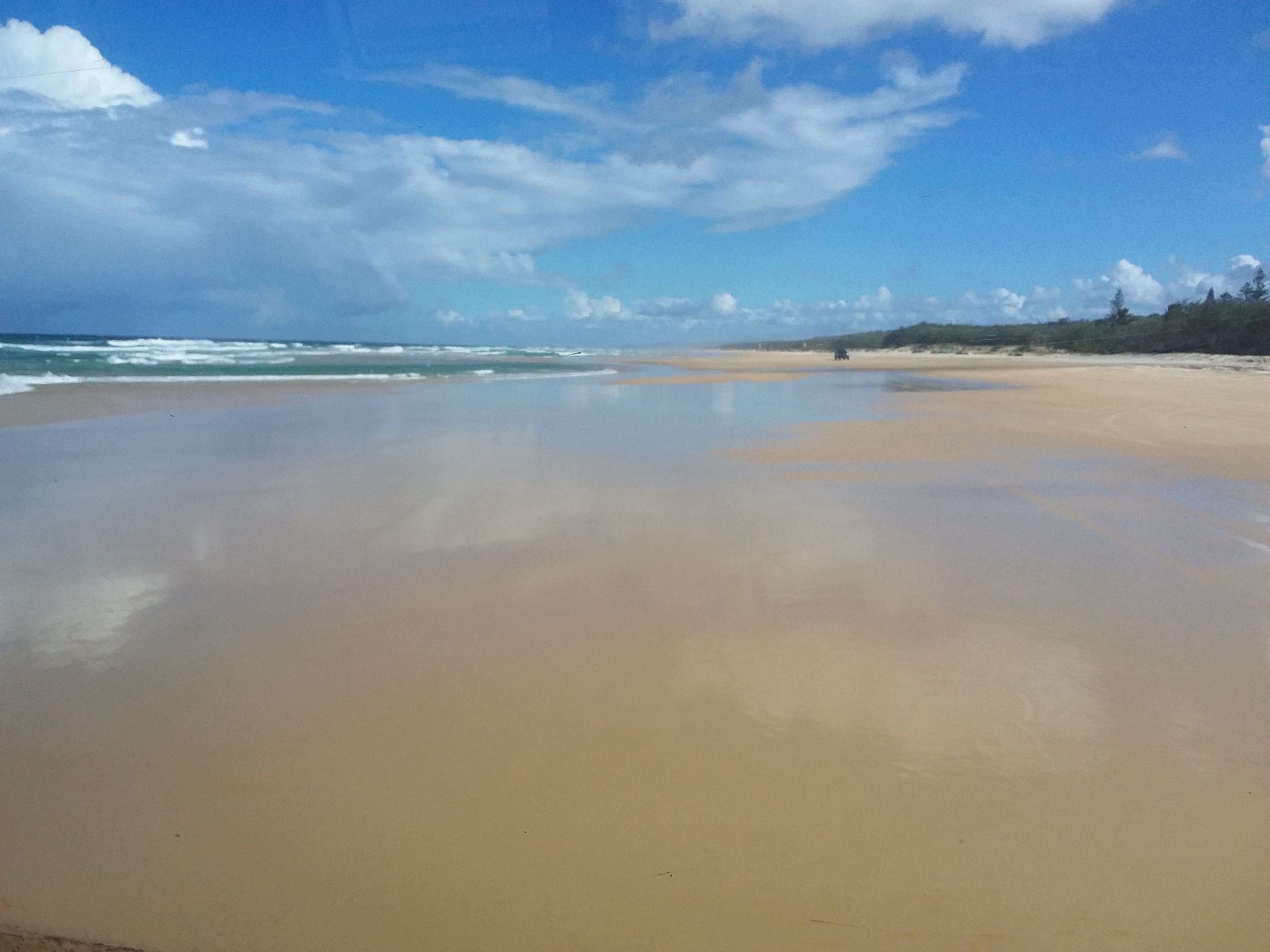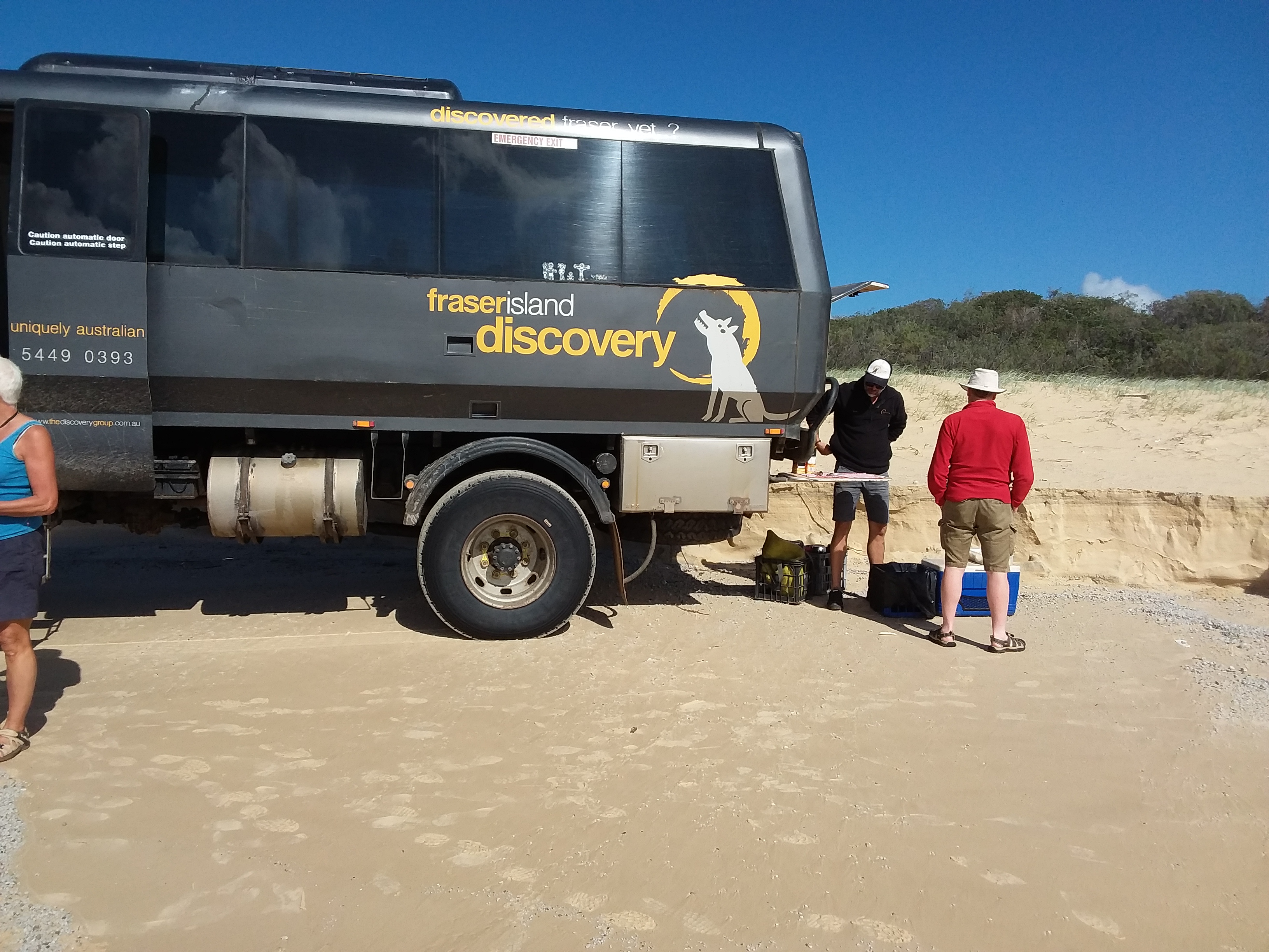 Walked along street to board feeder coach for Fraser Island tour. Drove out of town to a layby in the middle of nowhere. A few minutes later our 4wd coach turned up with driver/guide, Brock, at the wheel. Boarded with the warning that the further to the rear of the coach that you sit, the bouncier it will be! So, sitting in row 2, we headed off towards our first stop at Rainbow Beach shops. While we made use of the facilities and purchased breakfast, Brock deflated the tyres from 80 to 40psi in preparation for driving along the sand.